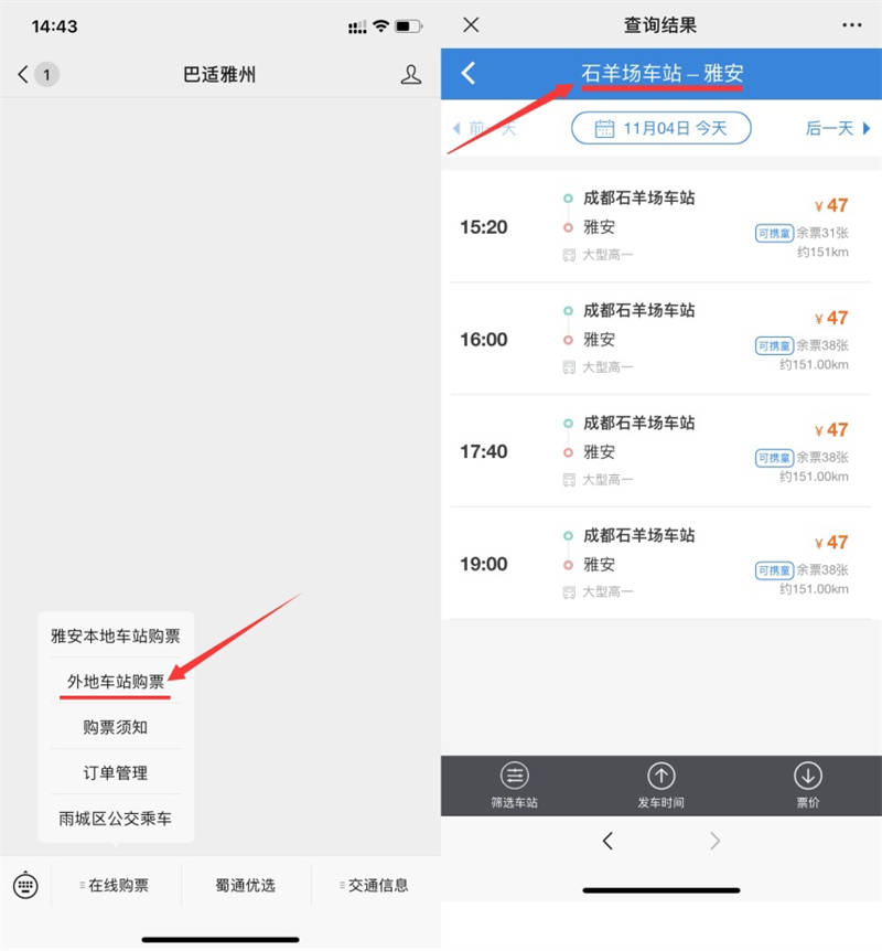 11月4日,蜀通公司線上購票平臺(tái)“巴適雅州”微信公眾號(hào)開通省內(nèi)外多地區(qū)汽車購票業(yè)務(wù)。