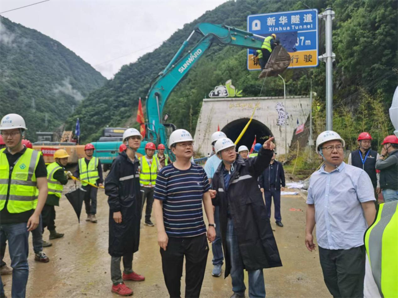 曹剛一行抵達(dá)寶興河電站,徒步前往新華村寶興河壅塞體查看災(zāi)情,附后前往新華村隧道口,看望慰問在搶通一線的交建集團(tuán)施工人員,詳細(xì)了解搶通進(jìn)度和安全保障措施等情況。