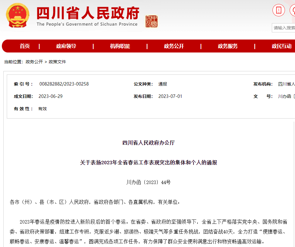 近日,四川省人民政府辦公廳印發(fā)《關(guān)于表?yè)P(yáng)2023年全省春運(yùn)工作表現(xiàn)突出的集體和個(gè)人的通報(bào)》,四川蜀通運(yùn)業(yè)有限公司榮獲 “2023年全省春運(yùn)工作表現(xiàn)突出集體”稱號(hào)。