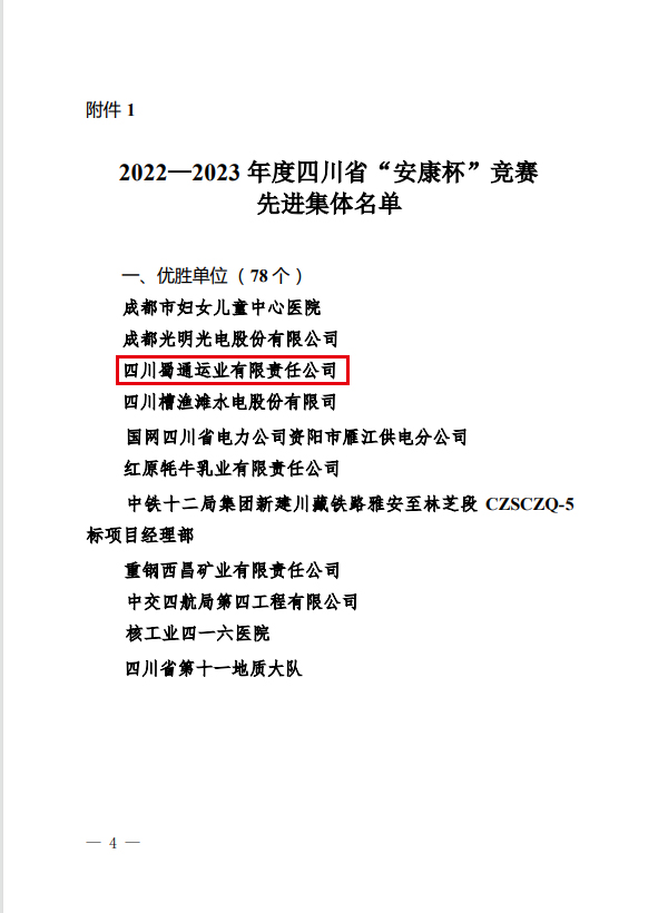 日前,省總工會(huì)、省應(yīng)急管理廳、省衛(wèi)健委聯(lián)合發(fā)文表揚(yáng)2022-2023年度四川省“安康杯”競(jìng)賽先進(jìn)集體和先進(jìn)個(gè)人,蜀通公司被評(píng)為“優(yōu)勝單位”。