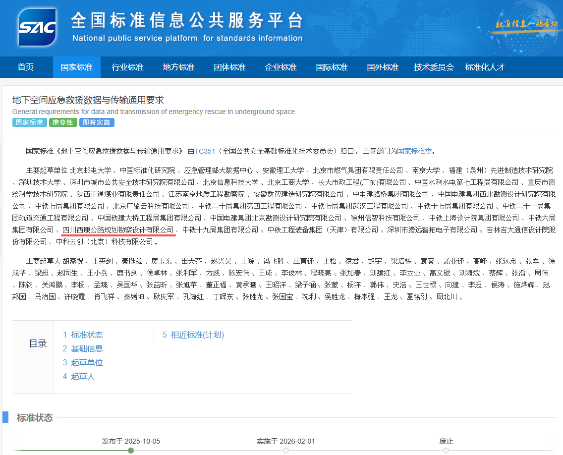 近日,由四川西康公路規(guī)劃勘察設(shè)計有限公司參與編制的推薦性國家標準GB/T 46338-2025《地下空間應(yīng)急救援?dāng)?shù)據(jù)與傳輸通用要求》經(jīng)國家標準委批準正式發(fā)布,將于2026年2月1日起正式實施。