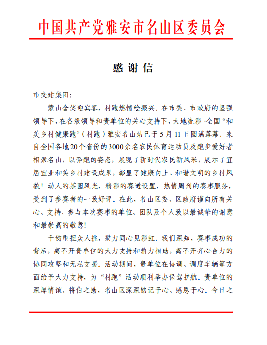5月10日至11日,以“心向和美 逐夢茶源”為主題的大地流彩·2025年全國和美鄉(xiāng)村健康跑(村跑)雅安名山站活動在雅安市名山區(qū)成功舉辦。四川蜀通運業(yè)有限責任公司作為運輸保障單位,圓滿完成賽事期間各項運輸保障任務,為活動的順利開展提供了堅實保障,受到名山區(qū)委、區(qū)政府感謝信。