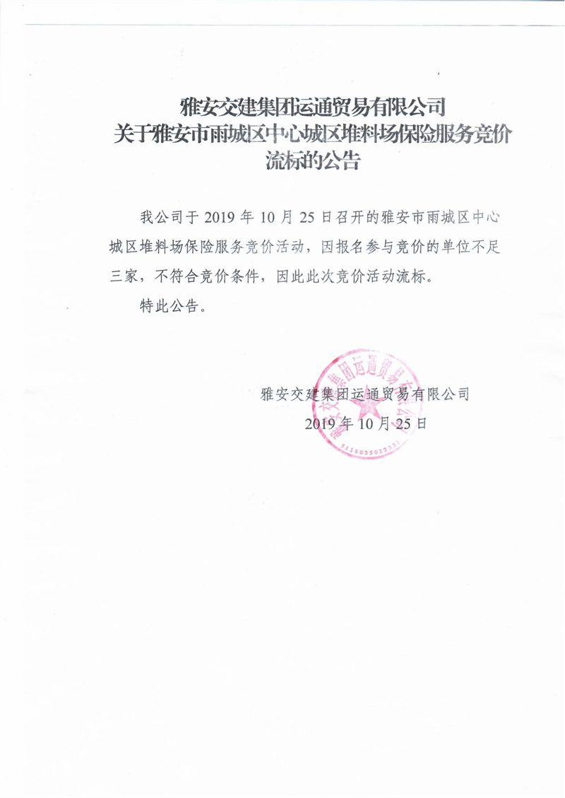 雅安交建集團運通貿(mào)易有限公司關于雅安市雨城區(qū)中心城區(qū)堆料場保險服務競價流標的公告