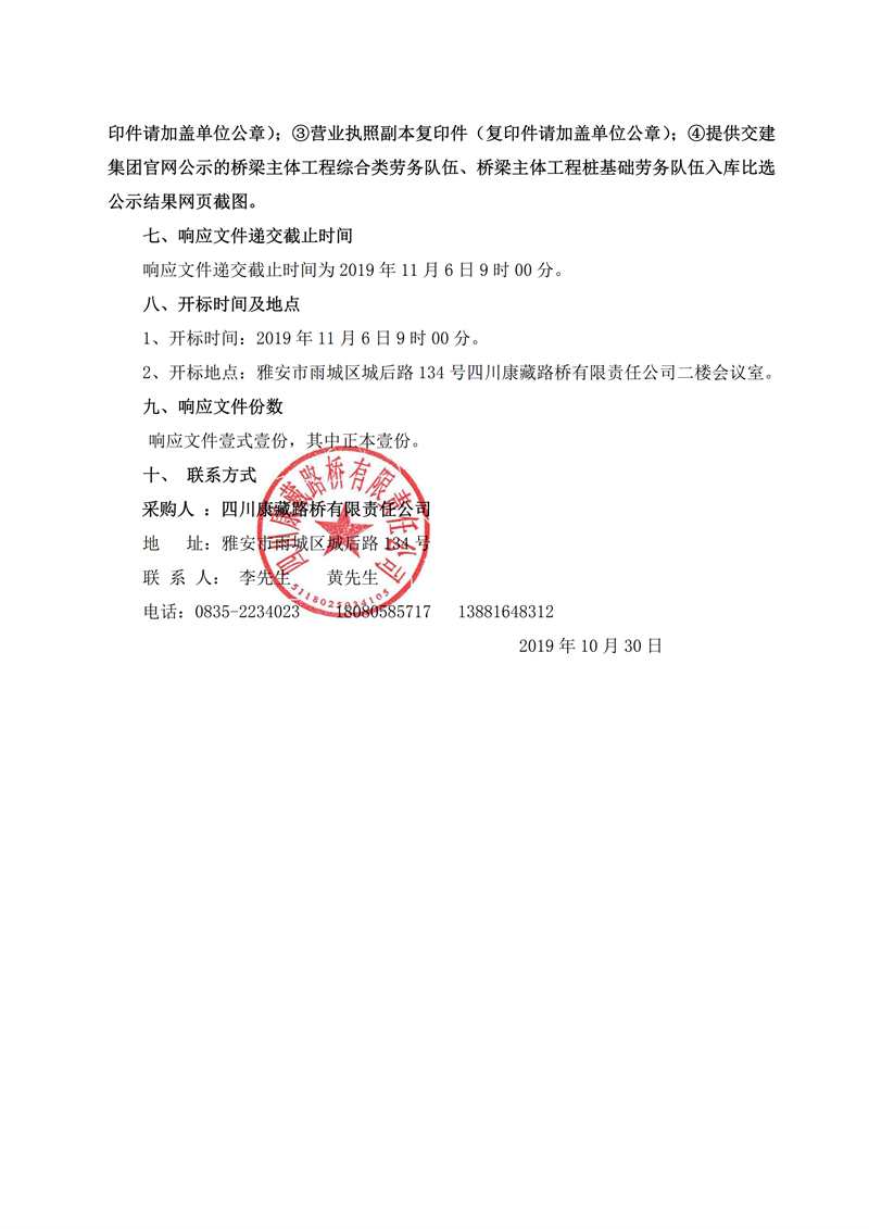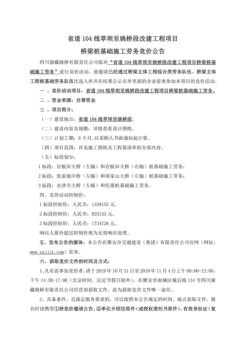 四川康藏路橋有限責(zé)任公司省道104線草壩至姚橋段改建工程項目橋梁樁基礎(chǔ)施工勞務(wù)競價公告
