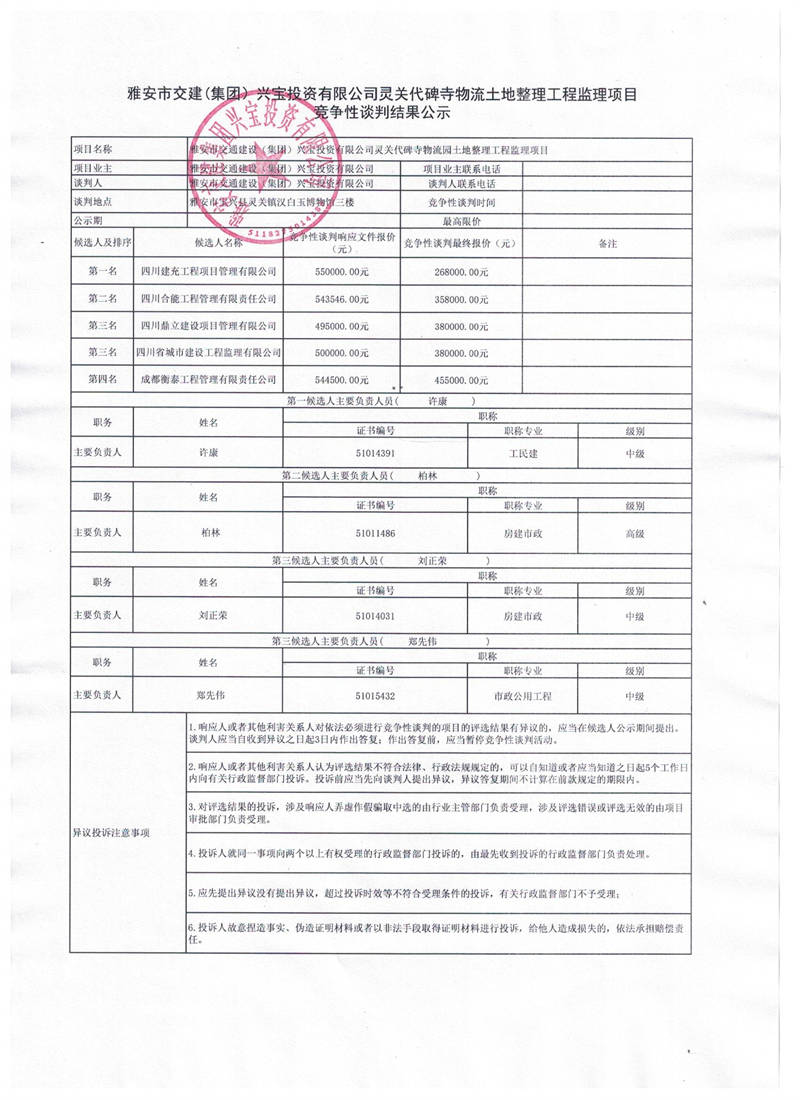 雅安交建集團興寶投資有限公司寶興縣靈關(guān)代碑寺物流園土地整理工程監(jiān)理項目競爭性談判結(jié)果公示