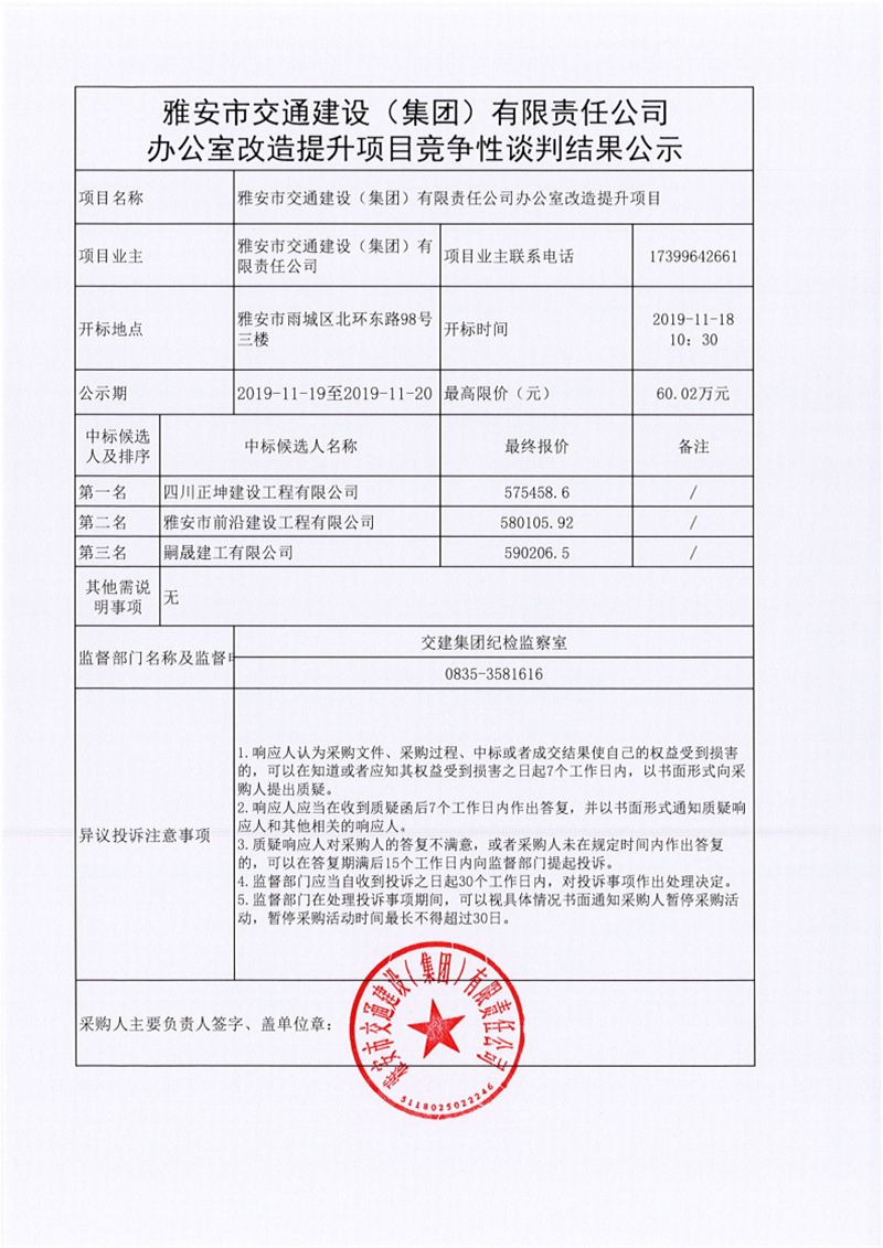 雅安市交通建設(集團)有限責任公司辦公室改造提升項目競爭性談判結果公示