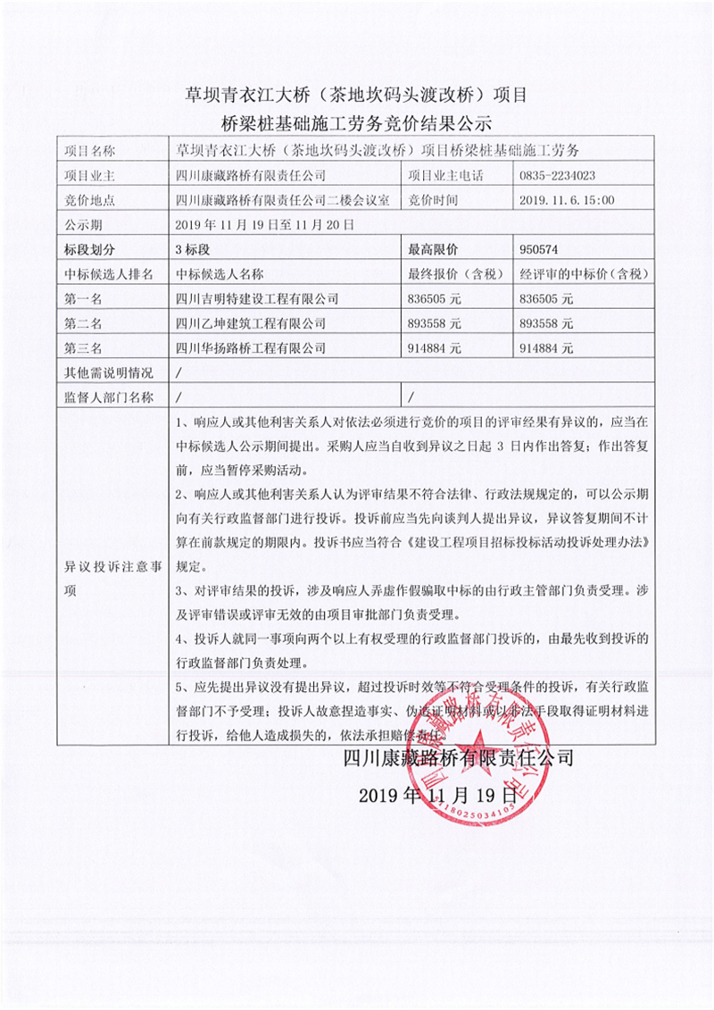 四川康藏路橋有限責任公司草壩青衣江大橋(茶地坎碼頭渡改橋)項目橋梁樁基礎施工勞務競價(3標段)結果公示
