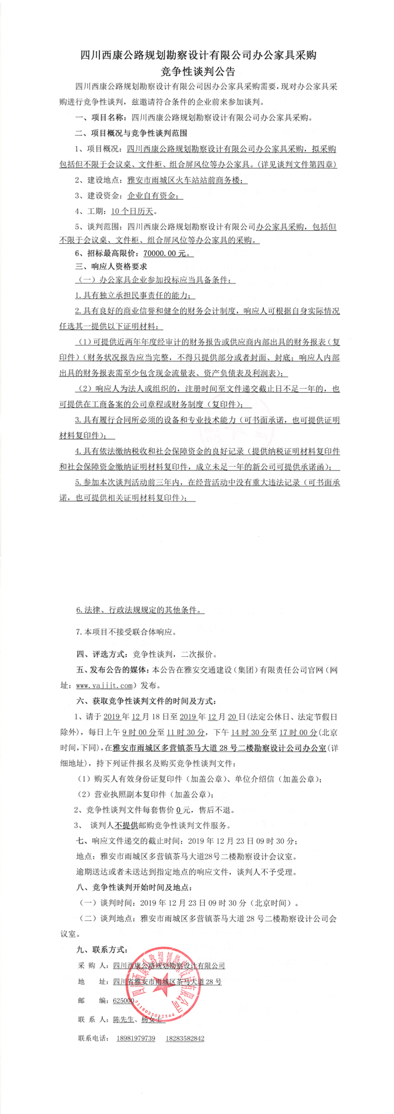 四川西康公路規(guī)劃勘察設(shè)計有限公司辦公家具采購競爭性談判公告