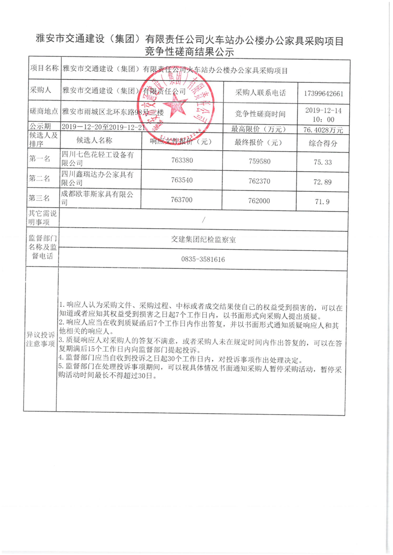 雅安市交通建設(集團)有限責任公司火車站辦公樓辦公家具采購項目競爭性磋商結果公示