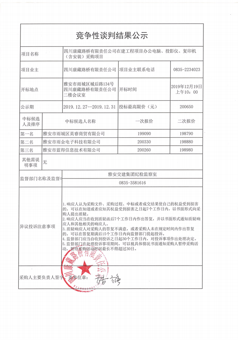 四川康藏路橋有限責(zé)任公司在建工程項目辦公電腦、投影儀、復(fù)印機(含安裝)采購項目競爭性談判結(jié)果公示