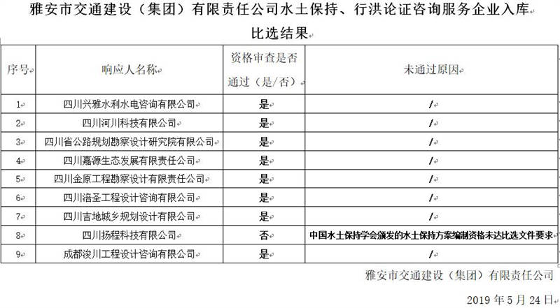 雅安市交通建設(shè)(集團(tuán))有限責(zé)任公司水土保持、行洪論證咨詢服務(wù)企業(yè)入庫比選結(jié)果公示