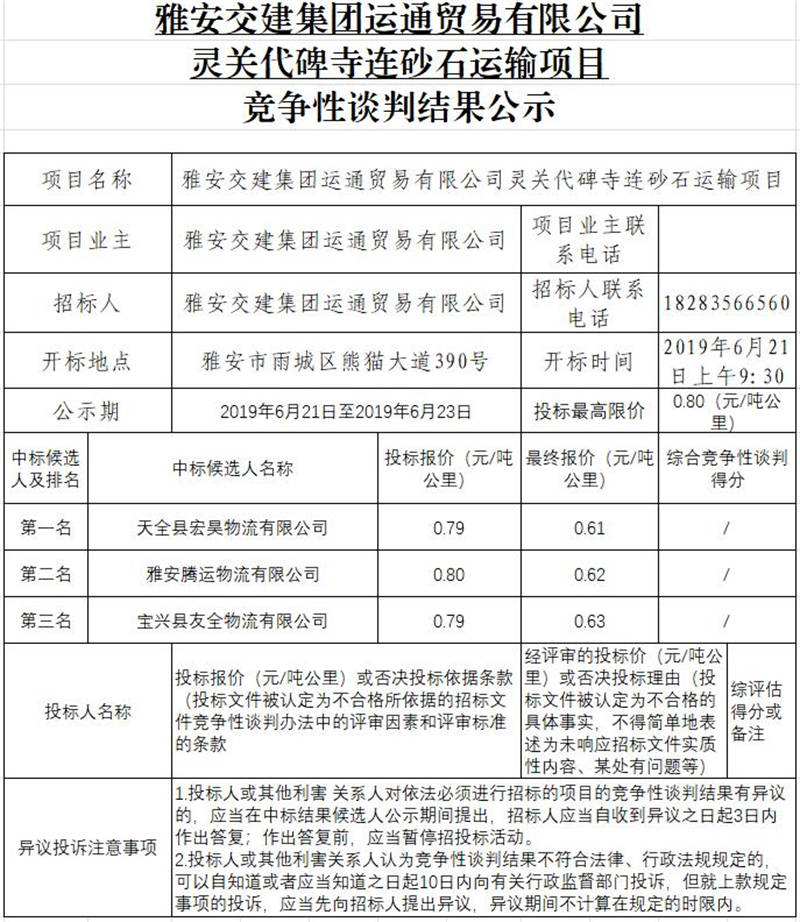 雅安交建集團(tuán)運(yùn)通貿(mào)易有限公司靈關(guān)代碑寺連砂石運(yùn)輸項(xiàng)目競(jìng)爭(zhēng)性談判結(jié)果公示