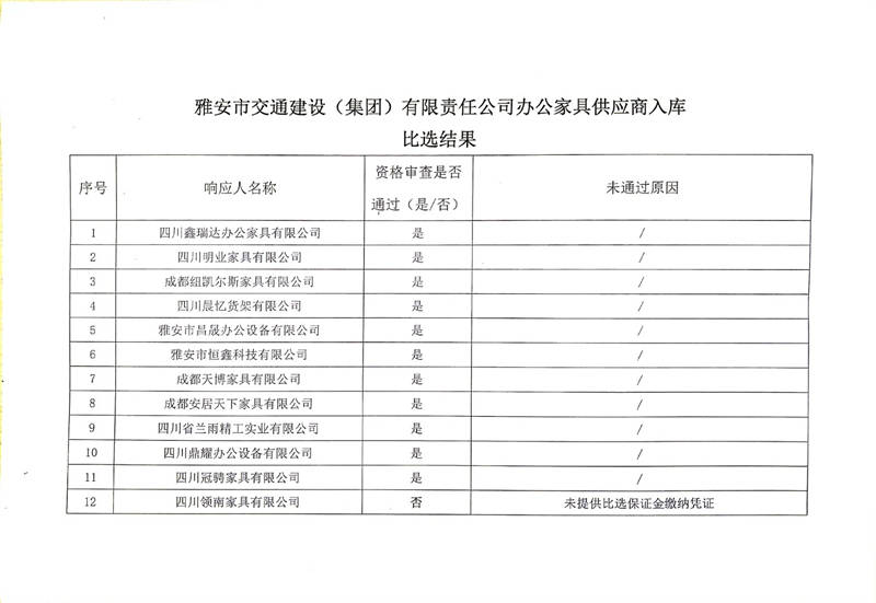 雅安市交通建設(shè)(集團)有限責(zé)任公司辦公家具供應(yīng)商入庫比選結(jié)果