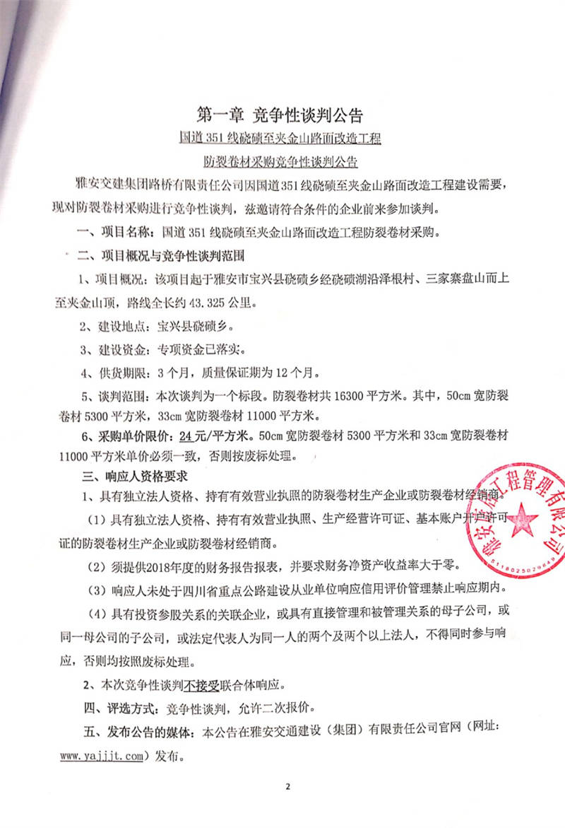 雅安交建集團(tuán)路橋有限責(zé)任公司國(guó)道351線磽磧至夾金山路面改造工程防裂卷材采購(gòu)競(jìng)爭(zhēng)性談判公告