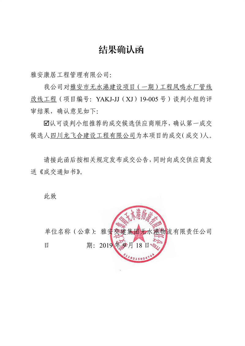 雅安交建集團無水港物流有限責任公司雅安市無水港建設項目(一期)工程鳳鳴水廠管線改線工程競爭性談判結(jié)果公示