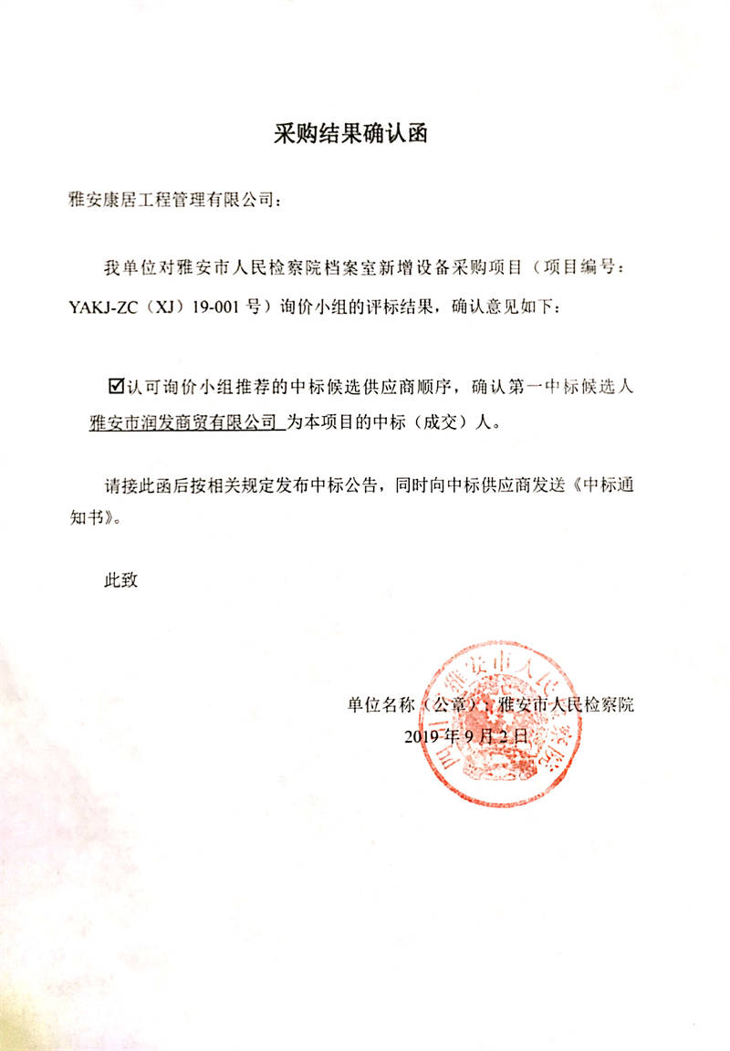 雅安市人民檢察院檔案室新增設(shè)備采購(gòu)項(xiàng)目結(jié)果公示