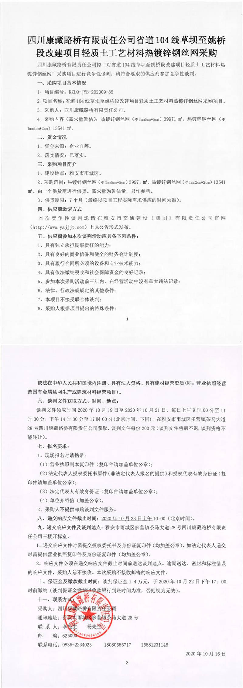 四川康藏路橋有限責任公司省道104線草壩至姚橋段改建項目輕質土工藝材料熱鍍鋅鋼絲網采購競爭性談判公告