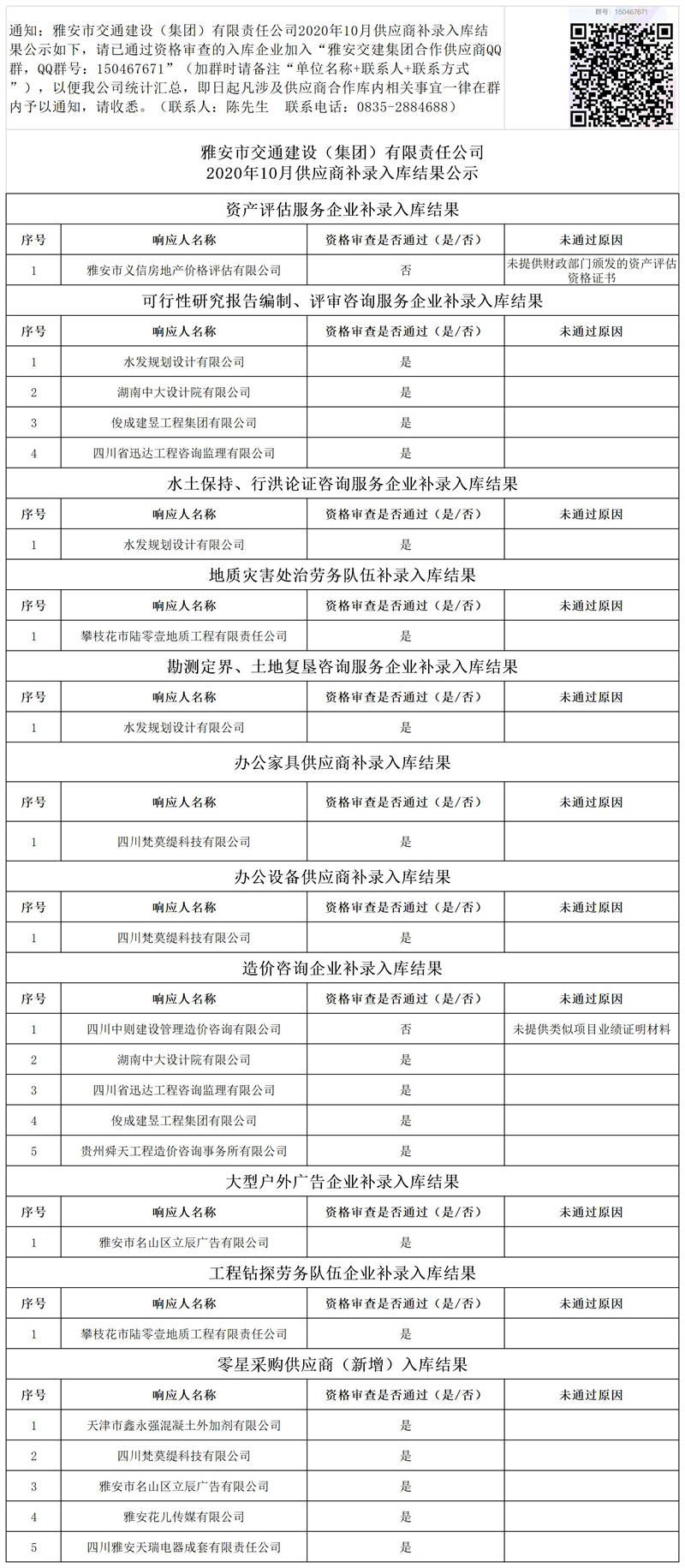 雅安市交通建設(shè)(集團)有限責任公司2020年10月供應(yīng)商補錄入庫結(jié)果公示