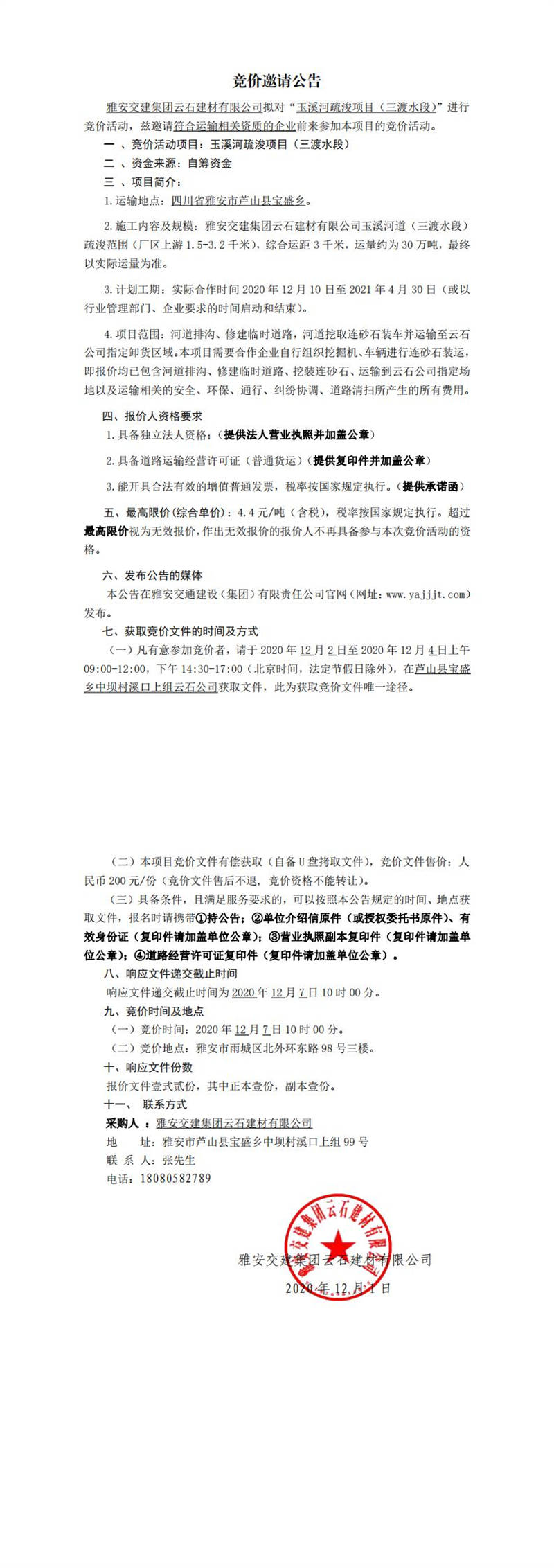 雅安交建集團(tuán)云石建材有限公司玉溪河疏浚項(xiàng)目(三渡水段)競價公告