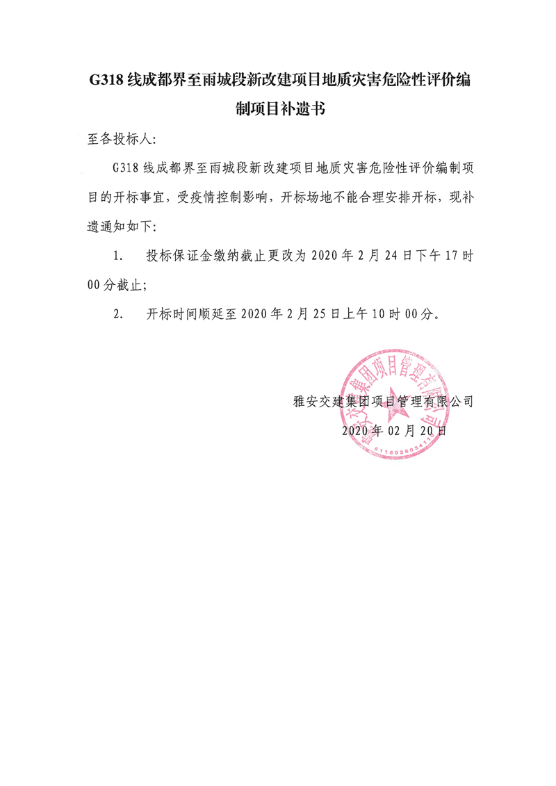 雅安交建集團(tuán)項(xiàng)目管理有限公司G318線成都界至雨城段新改建項(xiàng)目地質(zhì)災(zāi)害危險(xiǎn)性評價(jià)編制項(xiàng)目補(bǔ)遺書