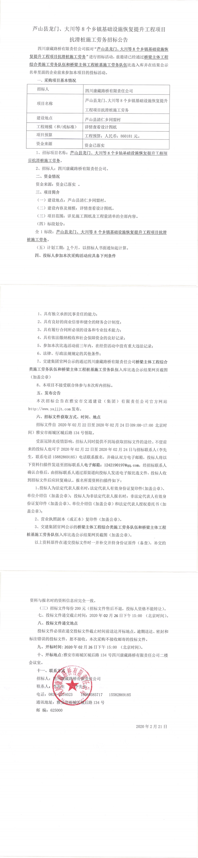 四川康藏路橋有限責任公司蘆山縣龍門、大川等8個鄉(xiāng)鎮(zhèn)基礎設施恢復提升工程項目抗滑樁施工勞務招標公告