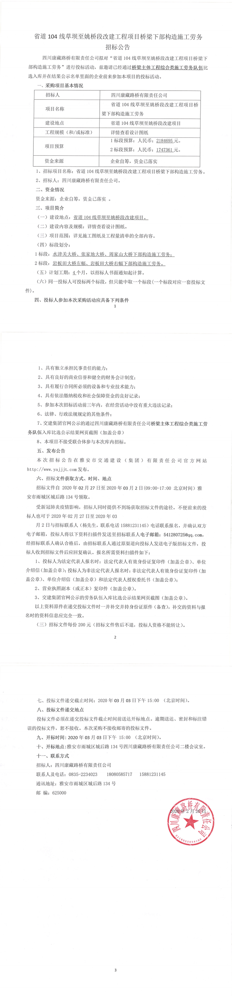 四川康藏路橋有限責任公司省道104線草壩至姚橋段改建工程項目橋梁下部構(gòu)造施工勞務招標公告