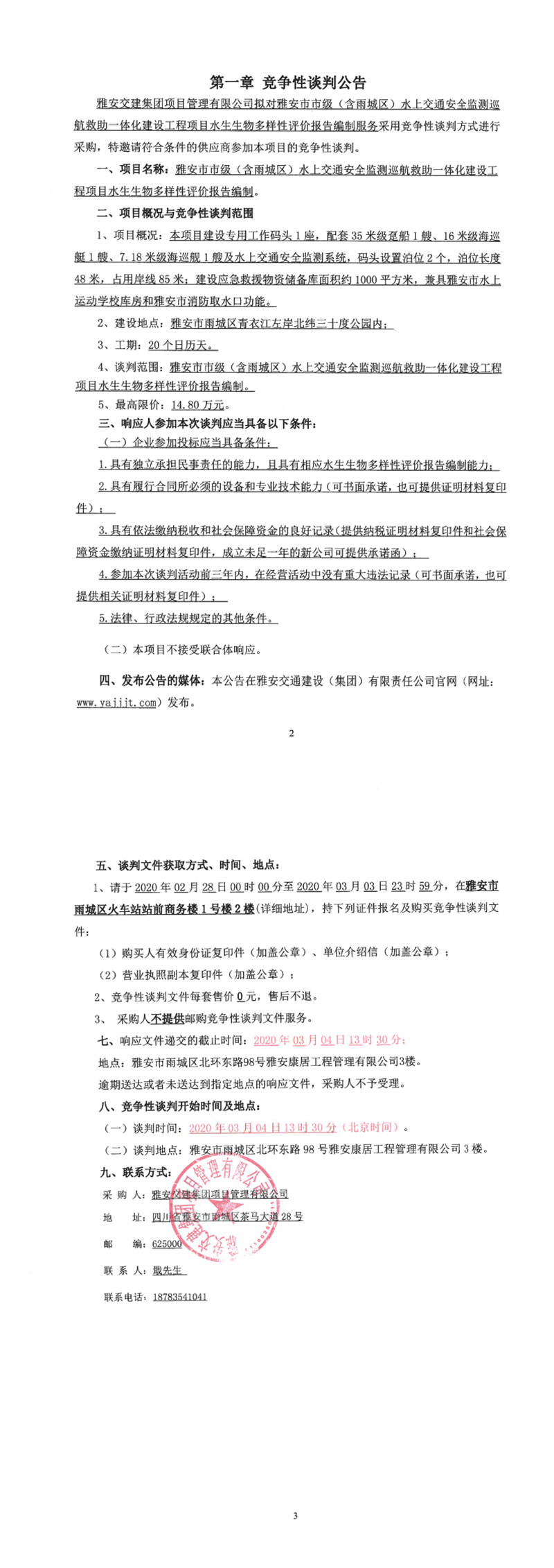 雅安交建集團項目管理有限公司雅安市市級(含雨城區(qū))水上交通安全監(jiān)測巡航救助一體化建設工程項目水生生物多樣性評價報告編制競爭性談判公告