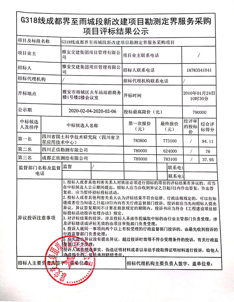 雅安交建集團(tuán)項(xiàng)目管理有限公司G318線成都界至雨城段新改建項(xiàng)目勘測(cè)定界服務(wù)采購(gòu)項(xiàng)目評(píng)標(biāo)結(jié)果公示