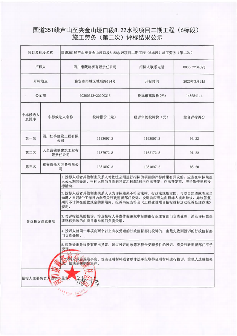 四川康藏路橋有限責(zé)任公司國(guó)道351線(xiàn)蘆山至夾金山埡口段8.22水毀項(xiàng)目二期工程(6標(biāo)段)施工勞務(wù)(第二次)評(píng)標(biāo)結(jié)果公示