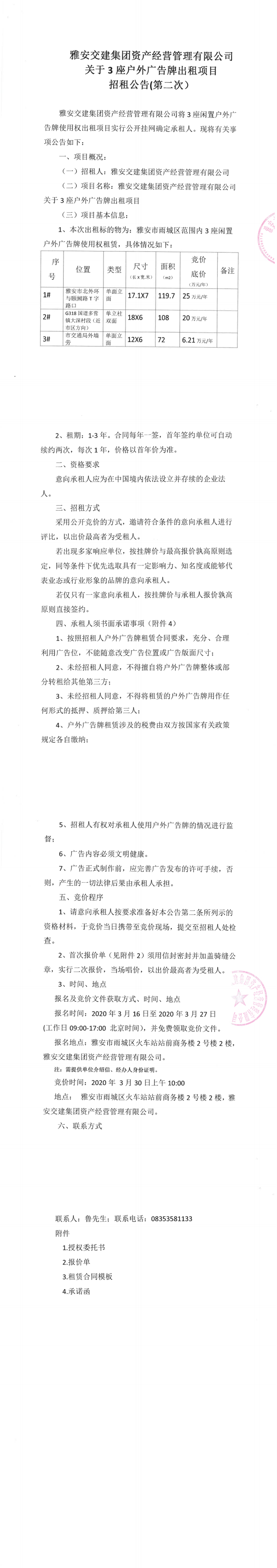 雅安交建集團資產(chǎn)經(jīng)營管理有限公司關(guān)于3座戶外廣告牌出租項目招租公告(第二次)