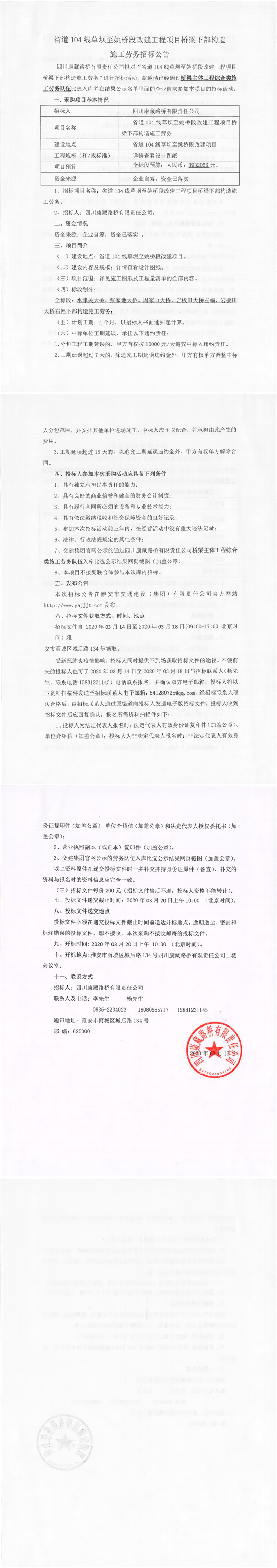 四川康藏路橋有限責(zé)任公司省道104線草壩至姚橋段改建工程項(xiàng)目橋梁下部構(gòu)造施工勞務(wù)招標(biāo)公告