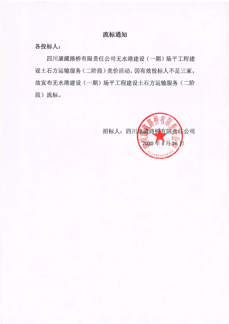 四川康藏路橋有限責(zé)任公司無水港建設(shè)(一期)場(chǎng)平工程建設(shè)土石方運(yùn)輸服務(wù)(二階段)流標(biāo)通知