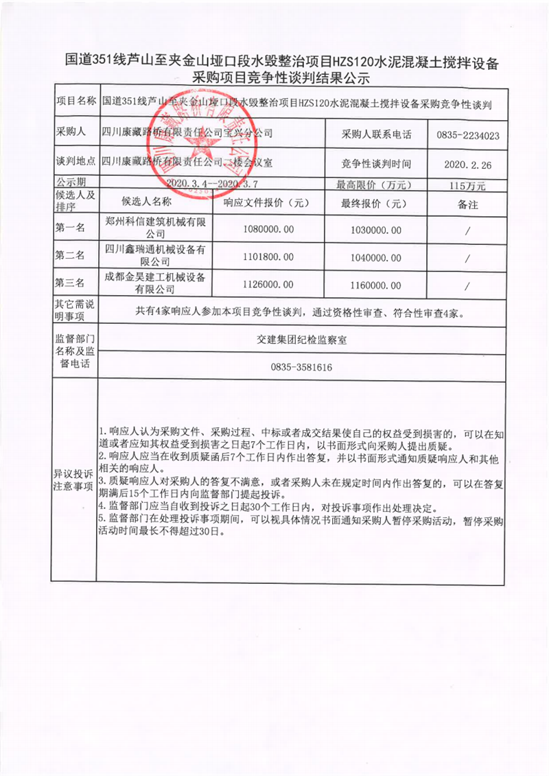 四川康藏路橋有限責(zé)任公司國道351線蘆山至夾金山埡口段水毀整治項(xiàng)目在建工程項(xiàng)目HZS120水泥混凝土攪拌設(shè)備采購項(xiàng)目競爭性談判結(jié)果公示