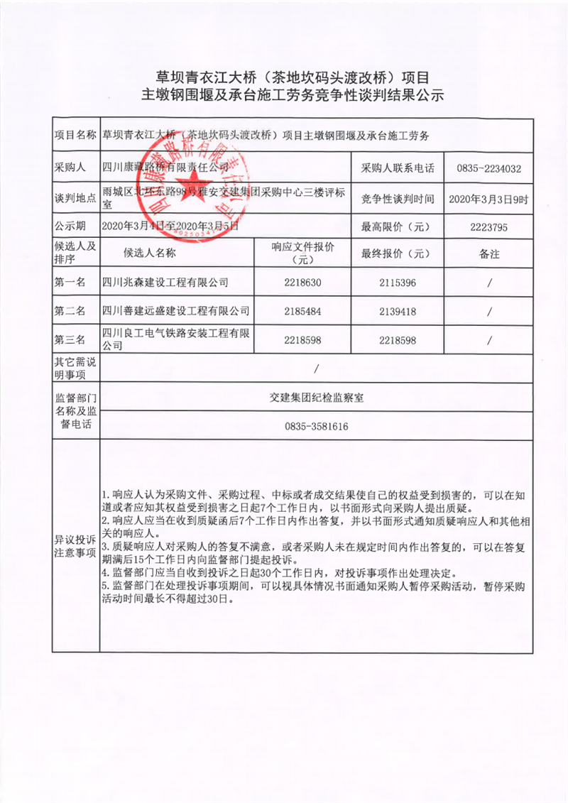 四川康藏路橋有限責(zé)任公司草壩青衣江大橋(茶地坎碼頭渡改橋)項(xiàng)目主墩鋼圍堰及承臺(tái)施工勞務(wù)競(jìng)爭(zhēng)性談判結(jié)果公示