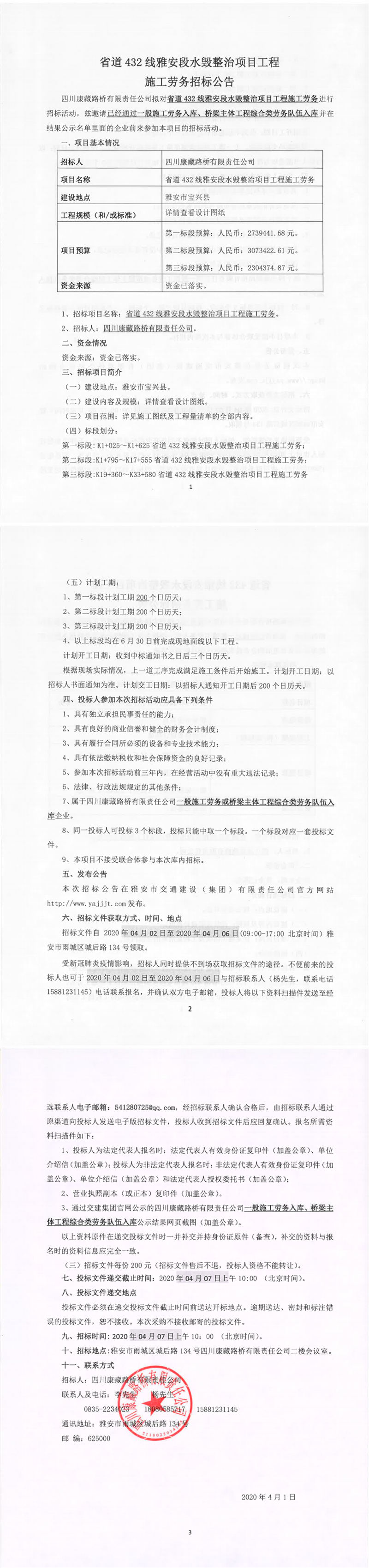 四川康藏路橋有限責任公司省道432線雅安段水毀整治項目工程施工勞務招標公告