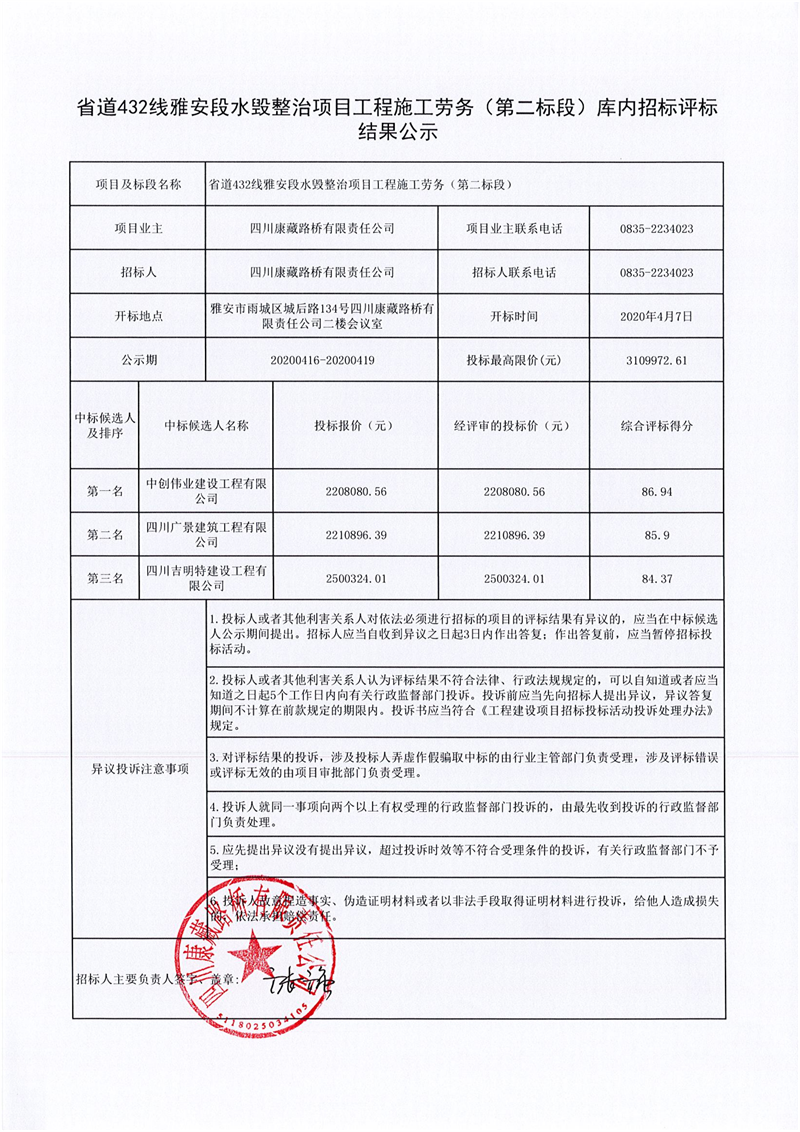 四川康藏路橋有限責(zé)任公司省道432線雅安段水毀整治項目工程施工勞務(wù)(第二標(biāo)段)庫內(nèi)招標(biāo)評標(biāo)結(jié)果公示