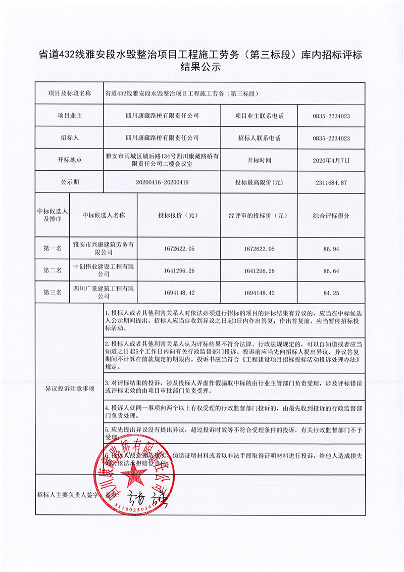 四川康藏路橋有限責(zé)任公司省道432線雅安段水毀整治項目工程施工勞務(wù)(第三標(biāo)段)庫內(nèi)招標(biāo)評標(biāo)結(jié)果公示