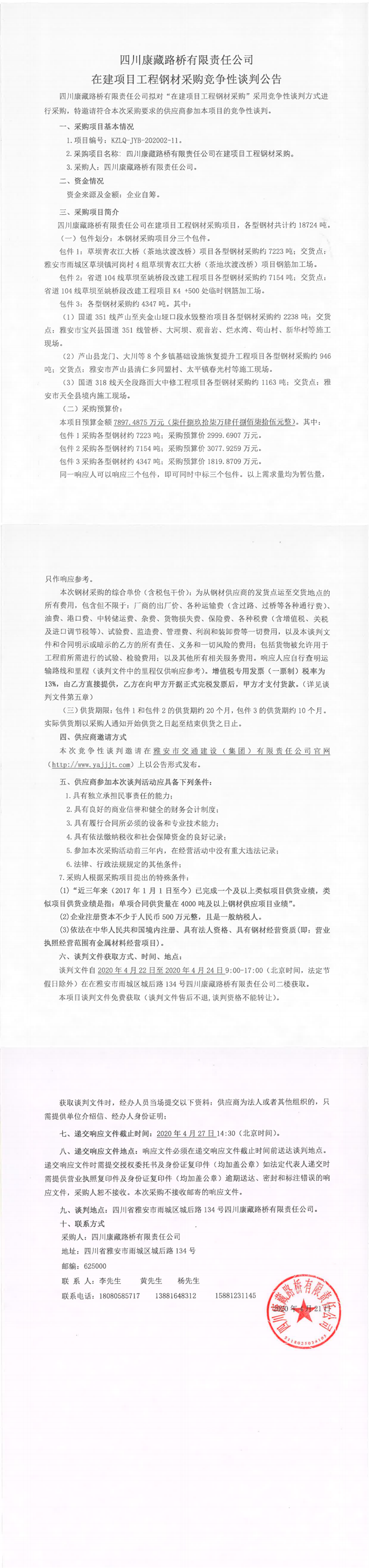四川康藏路橋有限責任公司在建項目工程鋼材采購競爭性談判公告