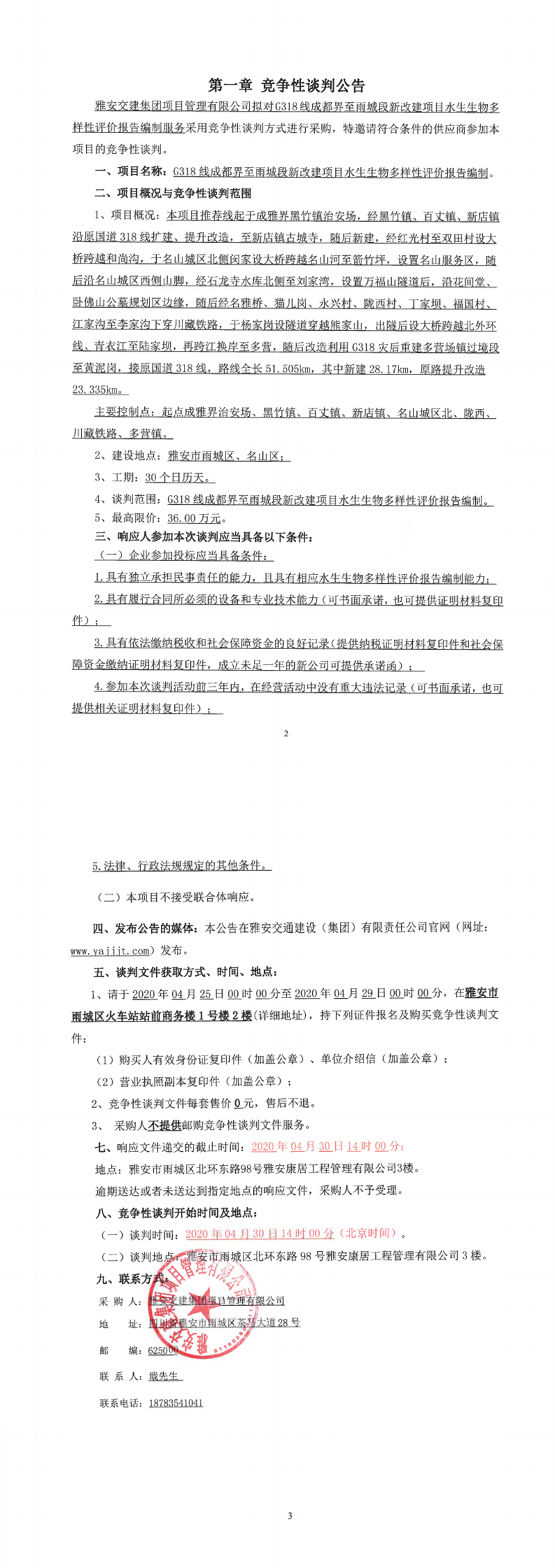 雅安交建集團項目管理有限公司G318線成都界至雨城段新改建項目水生生物多樣性影響評價編制競爭性談判公告