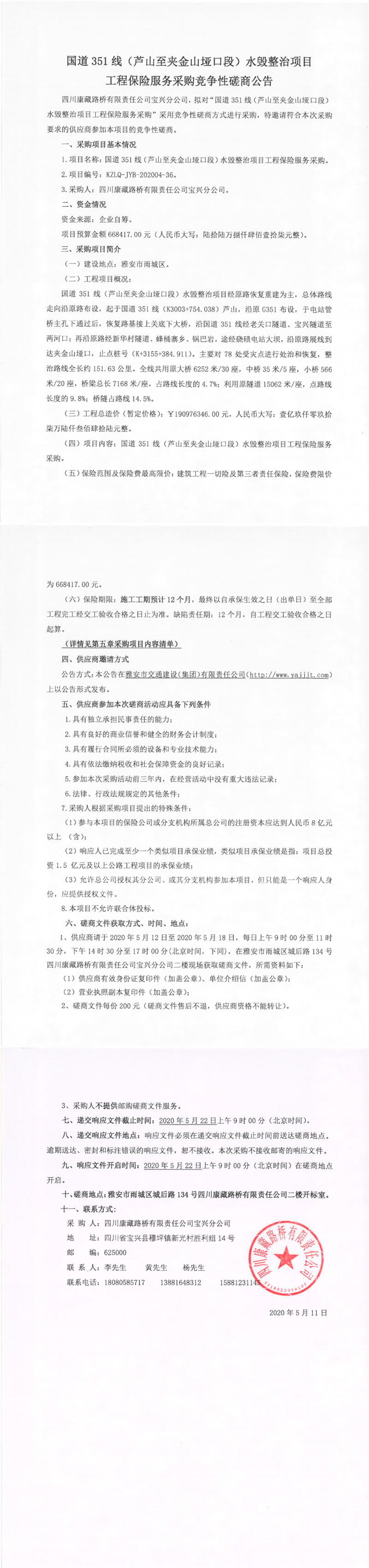 四川康藏路橋有限責(zé)任公司寶興分公司國(guó)道351線(xiàn)(蘆山至夾金山埡口段)水毀整治項(xiàng)目工程保險(xiǎn)服務(wù)采購(gòu)競(jìng)爭(zhēng)性磋商公告