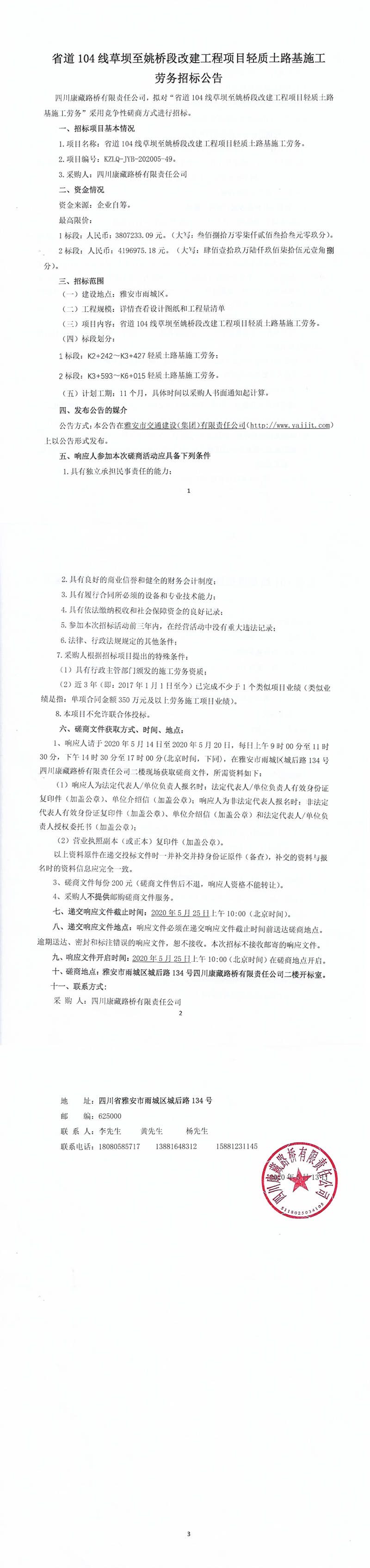 四川康藏路橋有限責任公司省道104線草壩至姚橋段改建項目輕質(zhì)土路基施工勞務(wù)招標公告