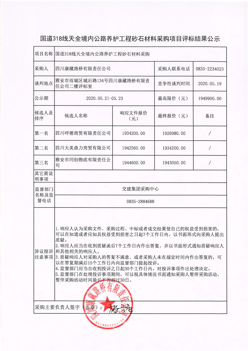 四川康藏路橋有限責(zé)任公司國(guó)道318線天全境內(nèi)公路養(yǎng)護(hù)工程砂石材料采購(gòu)項(xiàng)目評(píng)標(biāo)結(jié)果公示