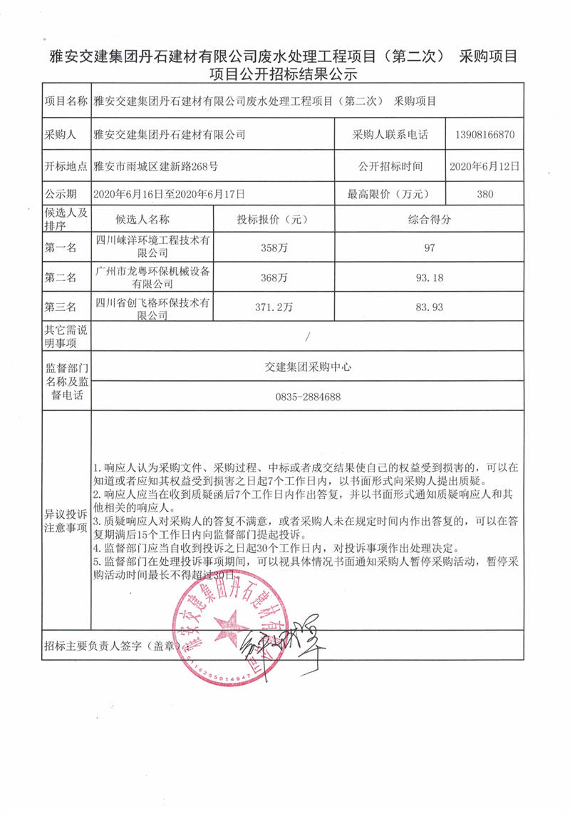 雅安交建集團丹石建材有限公司廢水處理工程項目(第二次)采購項目公開招標結(jié)果公示