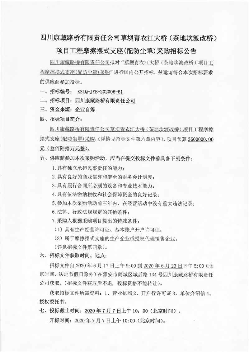 四川康藏路橋有限責(zé)任公司草壩青衣江大橋(茶地坎渡改橋)項(xiàng)目工程摩擦擺式支座(配防塵罩)采購招標(biāo)公告