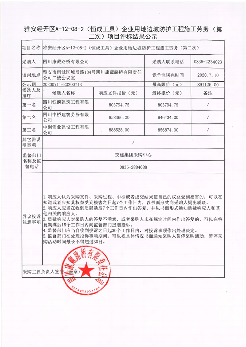 四川康藏路橋有限公司雅安經(jīng)開區(qū)A-12-08-2(恒成工具)企業(yè)用地邊坡防護(hù)工程施工勞務(wù)(第二次)項目評標(biāo)結(jié)果公示