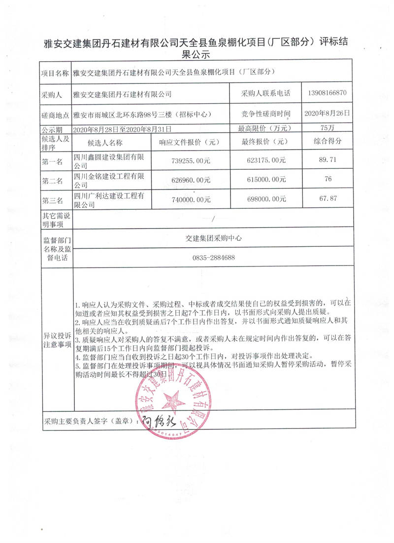 雅安交建集團(tuán)丹石建材有限公司天全縣魚泉棚化項目(廠區(qū)部分)評標(biāo)結(jié)果公示