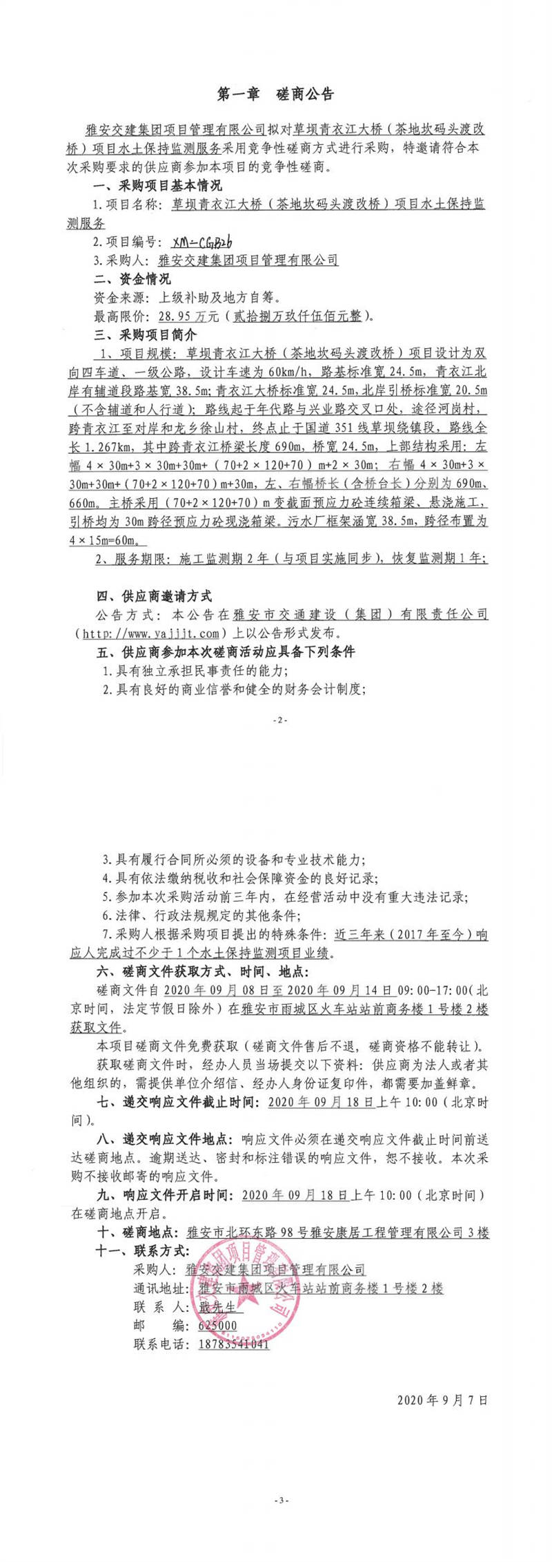 雅安交建集團(tuán)項(xiàng)目管理有限公司草壩青衣江大橋(茶地坎碼頭渡改橋)項(xiàng)目水土保持監(jiān)測服務(wù)競爭性磋商公告