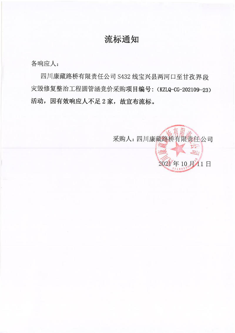 四川康藏路橋有限責(zé)任公司S432線寶興縣兩河口至甘孜界段災(zāi)毀修復(fù)整治工程圓管涵采購競價流標通知