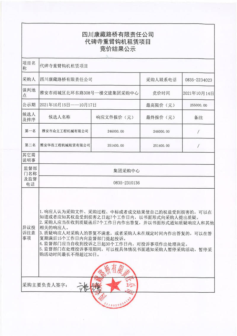 四川康藏路橋有限責(zé)任公司代碑寺重臂鉤機租賃項目競價結(jié)果公示