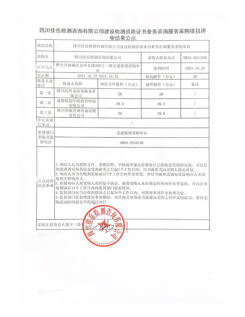 四川佳岳檢測咨詢有限公司建設(shè)檢測資質(zhì)證書業(yè)務(wù)咨詢服務(wù)采購項目評審結(jié)果公示